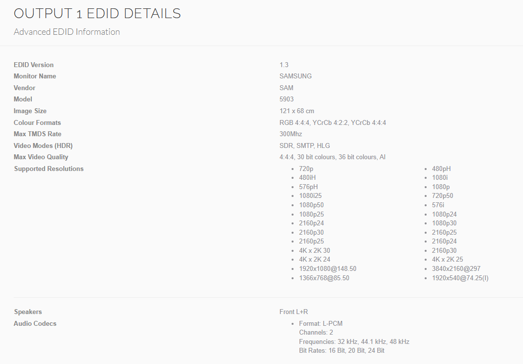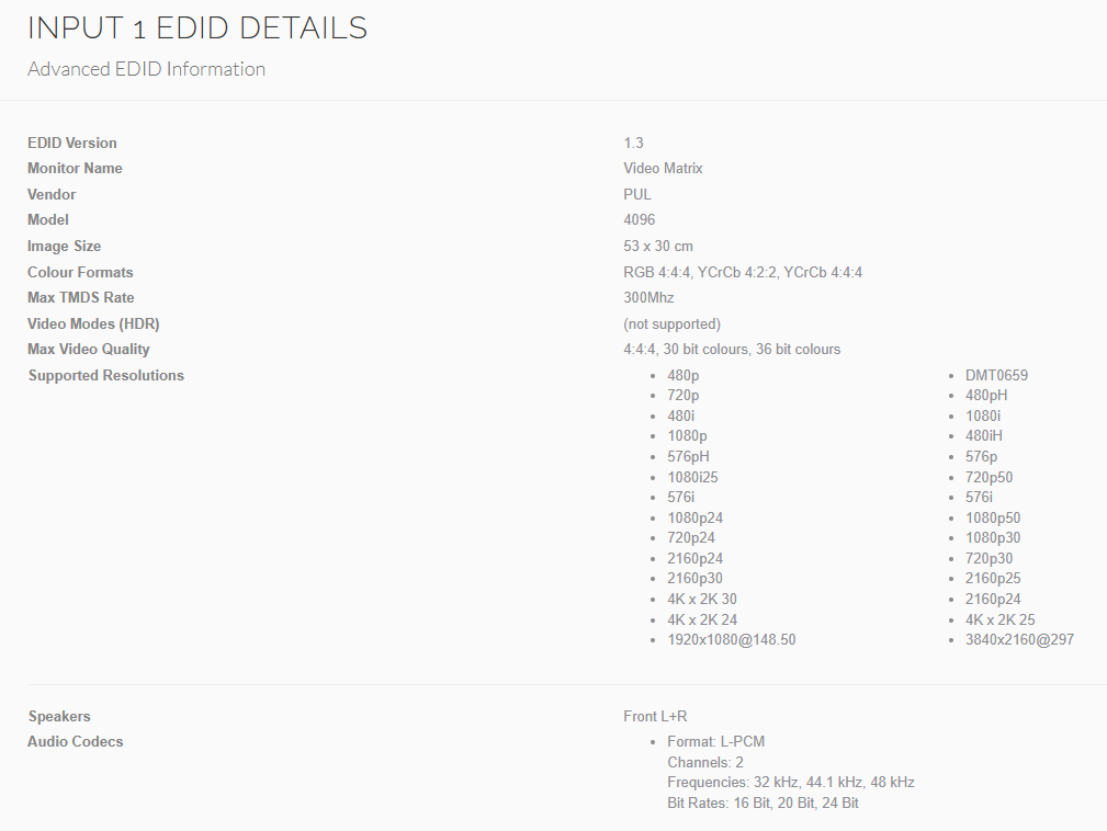 Here we can see the audio formats that the input device supports, in this case it can only support 2 channel PCM however if you are looking to run a surround sound system you would need to support 5.1 or 7.1 audio. Please note the capabilities of your matrix if you are planning to break out any of the audio via the audio output ports if available. Many of our matrices do not support Dolby Downmixing however we can pass through Dolby Audio via HDBaseT.
