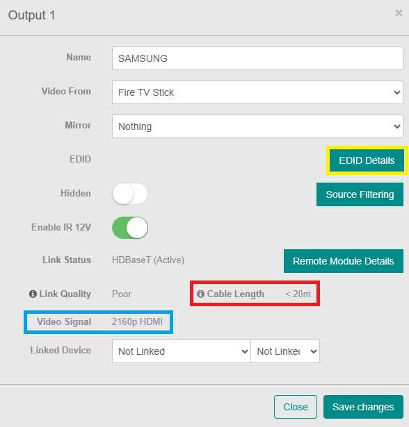 - RED The EDID profile, in this example we are requesting Ultra HD (4k), this can be changed to a different EDID profile for a number of potential reasons including but not limited to reducing bandwidth for longer transmission, ensuring that all the TVs are able to accept this EDID if this is not done automatically, changing the Audio EDID for the use of a surround sound system.