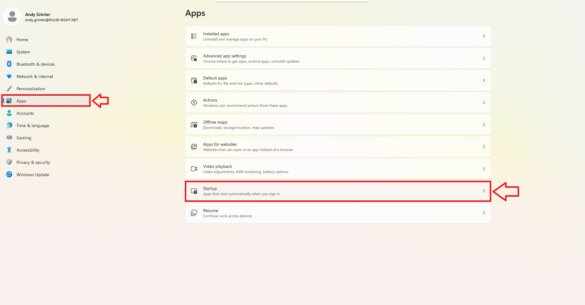 Then open your PC Settings, click the Apps tab on the left and then select Startup from the list