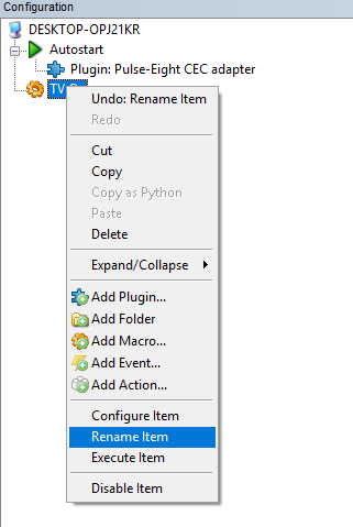 3. Rename this macro to 'TV On' by right clicking the macro and selecting rename item