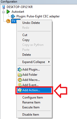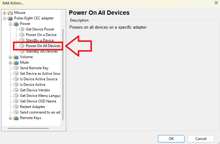 5. On the 'Add Actions...' Window that opens locate Pulse-Eight CEC adapter and click the plus to see more, then locate the Power folder and click the plus here to see more, locate 'Power On All Devices', select this and click OK