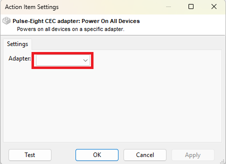 6. The 'Action Items Settings' window will now open, select your CEC adapter from the drop down, click Apply and OK