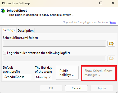 3. The Plugin Item Settings window for SchedulGhost will open, click the