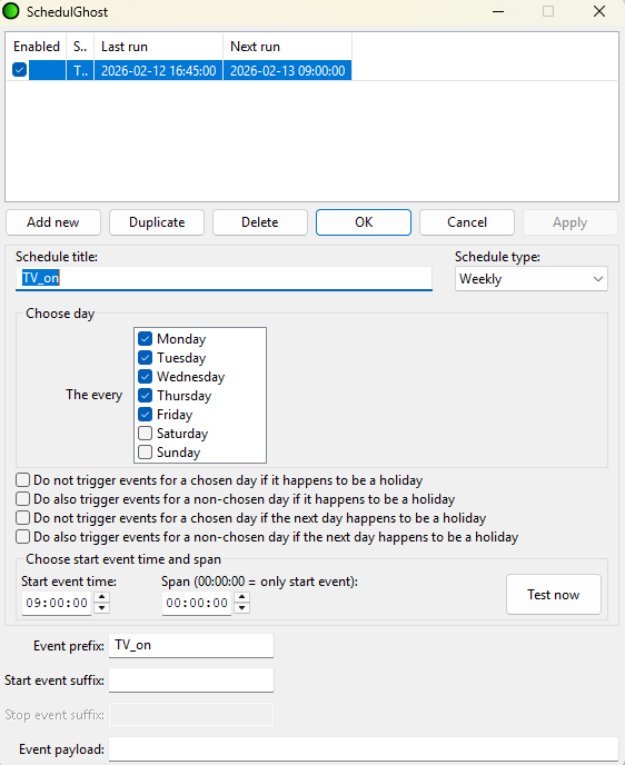 5. Here you can set your preferred schedule including days and times. This will need to be customised for your needs but I will be configuring my system to turn on the TV at 9am on weekdays and will look like this.